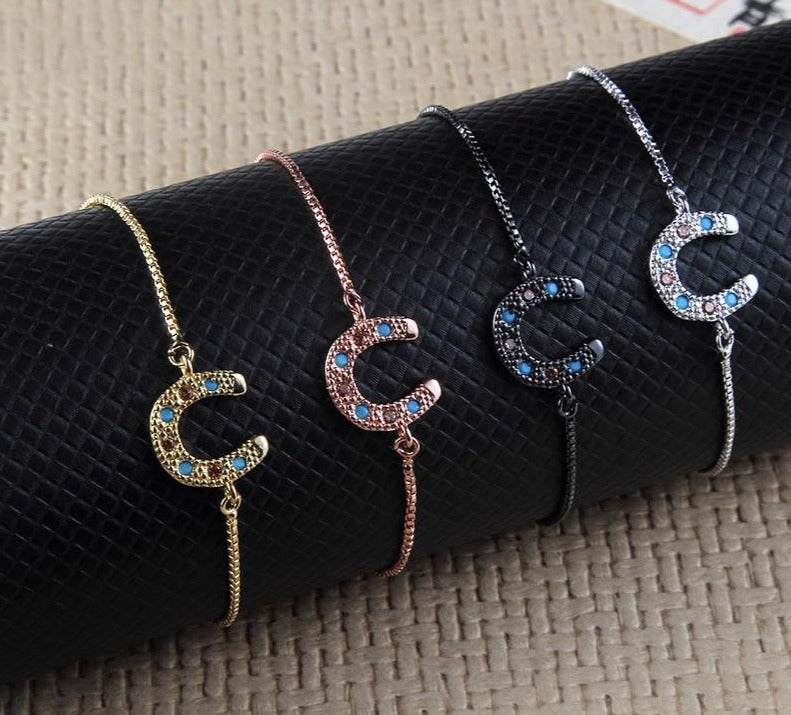 Ce bracelet arbore un fer à cheval délicatement incrusté de cristaux, un symbole de chance et de complicité avec le cheval. Conçu pour les passionnés d'équitation, il se porte comme un talisman élégant qui rappelle les longues sorties et les moments suspendus à l'écurie. Son design simple mais raffiné convient aussi bien aux sorties quotidiennes qu'aux rassemblements équestres, apportant une touche lumineuse sans prétention.