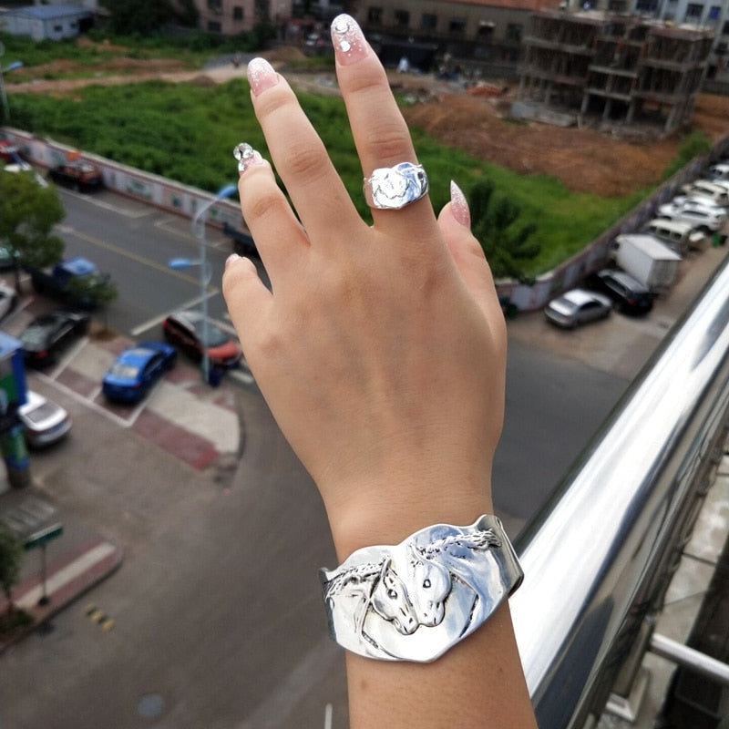 Ce bracelet forgé évoque les bijoux antiques par son esprit vieux style et ses courbes élégantes. Son motif cheval symbolise la grâce et la liberté, un clin d'œil à ceux qui aiment les chevaux. Disponible en trois variantes, chacune capture la silhouette fière de l'animal, à la fois décoratif et chargé d'histoire. Sa fabrication solide promet une compagnie fidèle au quotidien et une touche d'élégance discrète.