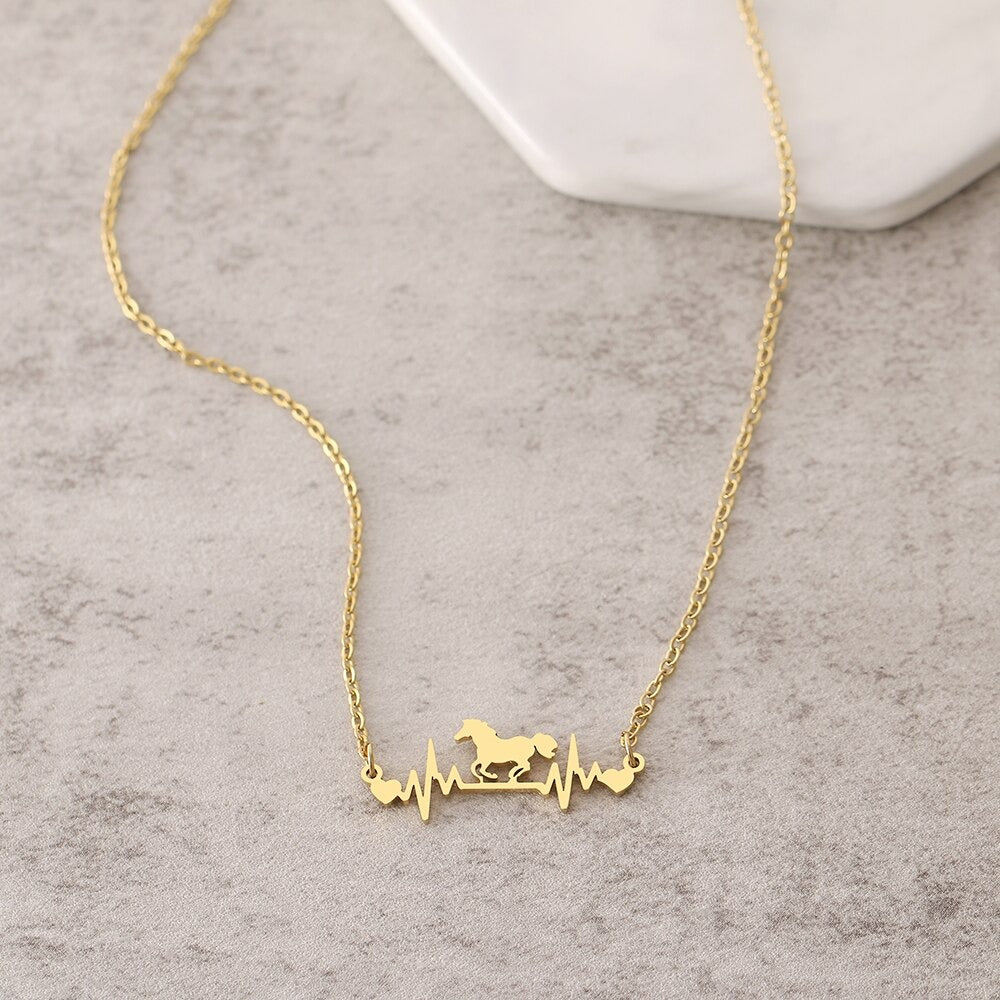 Le Collier Cheval Battement de Cœur capture la passion qui anime les amoureux des chevaux. Ce pendentif symbolique évoque le battement du cœur lorsque l'on vit pleinement sa passion pour l'équitation. Conçu en acier inoxydable, il est durable et élégant, avec une maille Jaseron renforcée qui assure confort et style au quotidien. Longueur 45 cm, pendentif 35 × 15 mm, poids environ 22 g. Livraison standard offerte.