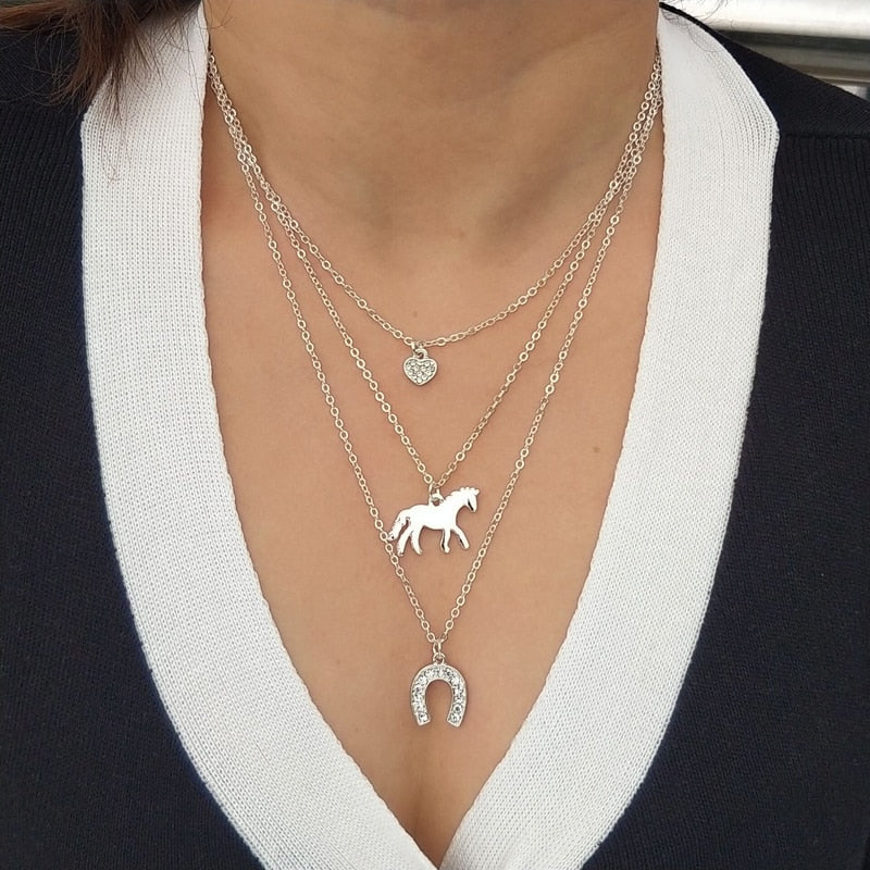 Cet ensemble réunit trois colliers au design symbolique des chevaux: un petit cœur, un cheval au trot et un fer à cheval porte-bonheur. Chaque pendentif est solidement façonné et s’accorde à merveille sur une même chaîne, pour un look élégant et intemporel. Destiné aux passionnés d’équitation, cet ensemble évoque l’amour des chevaux et se porte aussi bien au quotidien qu’en occasions spéciales.