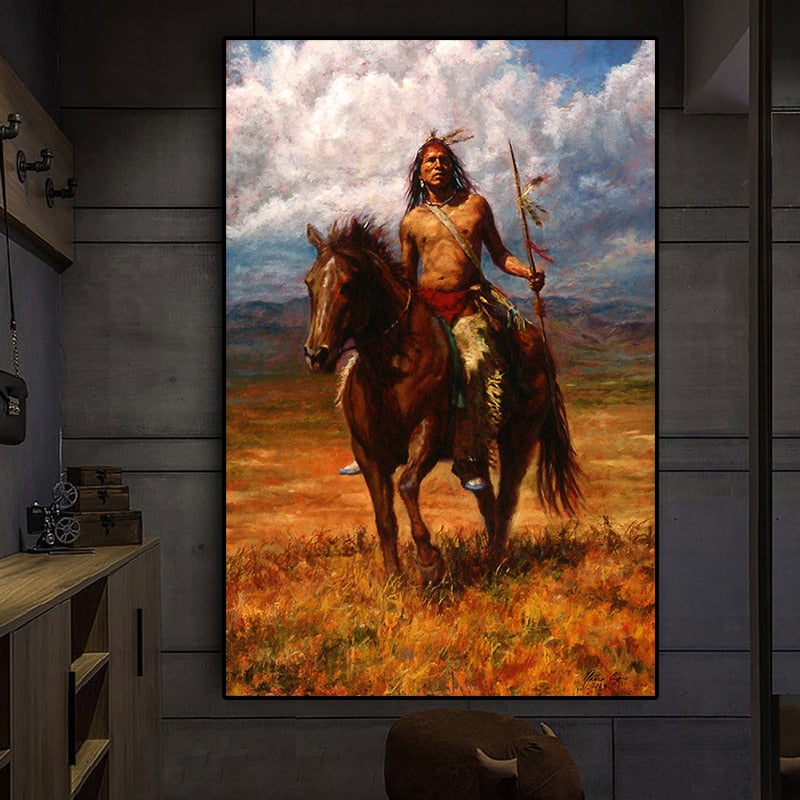 Plongez dans l'audace et la dignité de l'Ouest avec cette peinture Cheval Indien, parfaite comme décoration murale expressive. Cette scène capture le lien intime entre un chef indien et sa monture, transmise avec chaleur et poésie, pour insuffler énergie, caractère et storytelling à votre salon, bureau ou chambre. Son style chaleureux s'accorde avec des murs neutres ou audacieux.