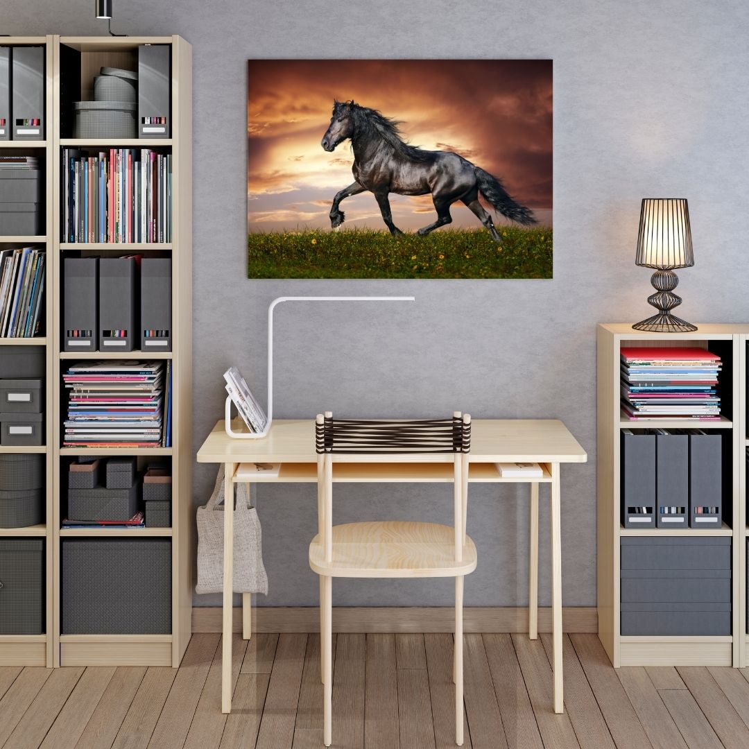 Le Frison, cheval de prestige, s’impose avec énergie et élégance sur votre mur. Ce poster transmet la puissance et la grâce de la race au trot, dans un décor qui invite au voyage et à la rêverie. Une pièce lumineuse et expressive qui dynamise votre intérieur et célèbre la beauté noble des chevaux de trait. Parfaite pour un salon, une chambre ou une entrée.